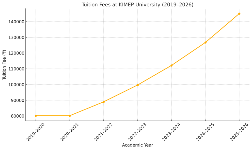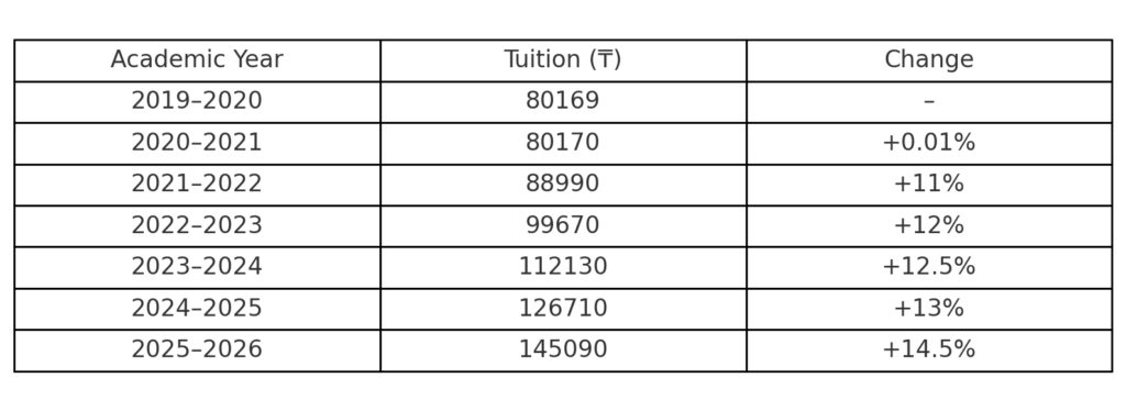 Caption: The tuition nearly doubled over seven years, rising from ₸80 169 to ₸145 090 (+81% total increase).g